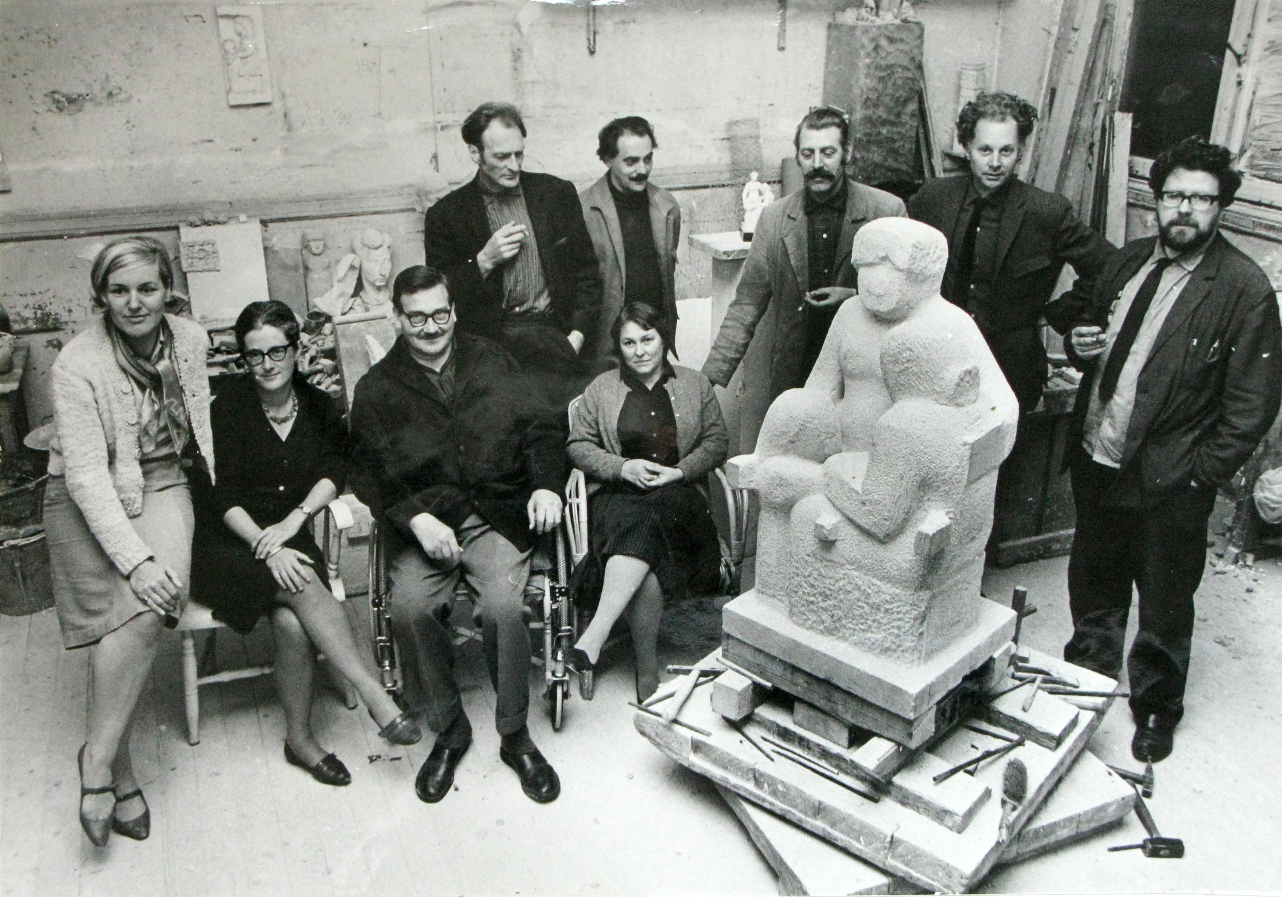 Shortly after the war, Meefout moved into a studio in an old school building on the Third Wittenburgerdwarsstraat. There he worked on his sculptures. At that time, only part of the building was available to artists; the rest still functioned as a school. Surrounded by artist friends, Meefout was able to devote himself fully to sculpture. Fellow sculptors Arie Teeuwisse, Herman Janzen, and Cor Hund also had studios there. Later, Fioen Blaisse and Theresia van der Pant joined them — all depicted in the photograph of Jan Meefout’s studio. A sculpture by Theresia van der Pant is also exhibited at Kunstconsult.