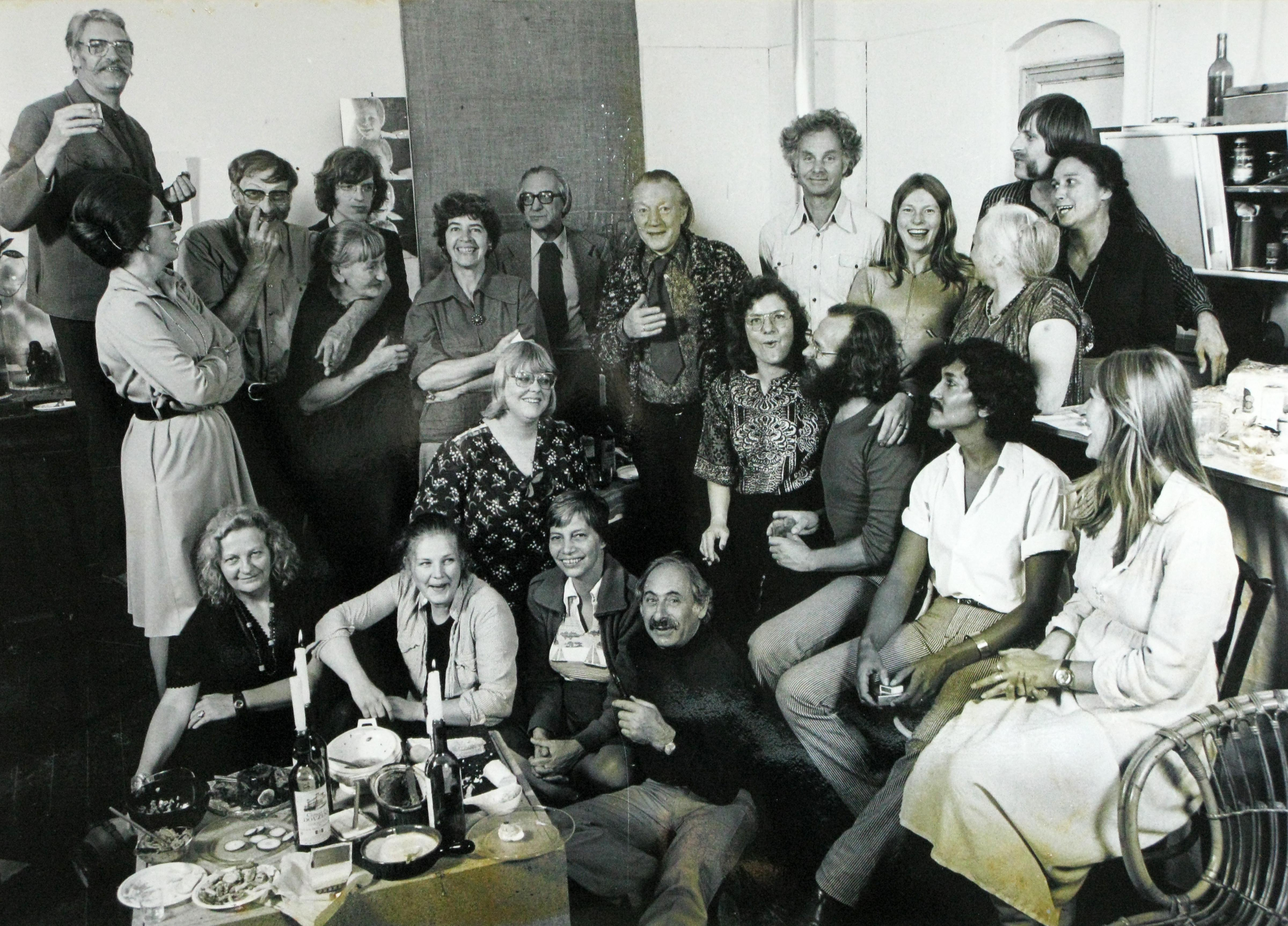 Seated: Fioen Blaisse, Theresia van der Pant, (Henk Dannenburg), Julia Verschuer. Standing: Jan Meefout, (Herman Janzen), Joop Willems, Jaap Kruijff, Arie Teeuwisse.
