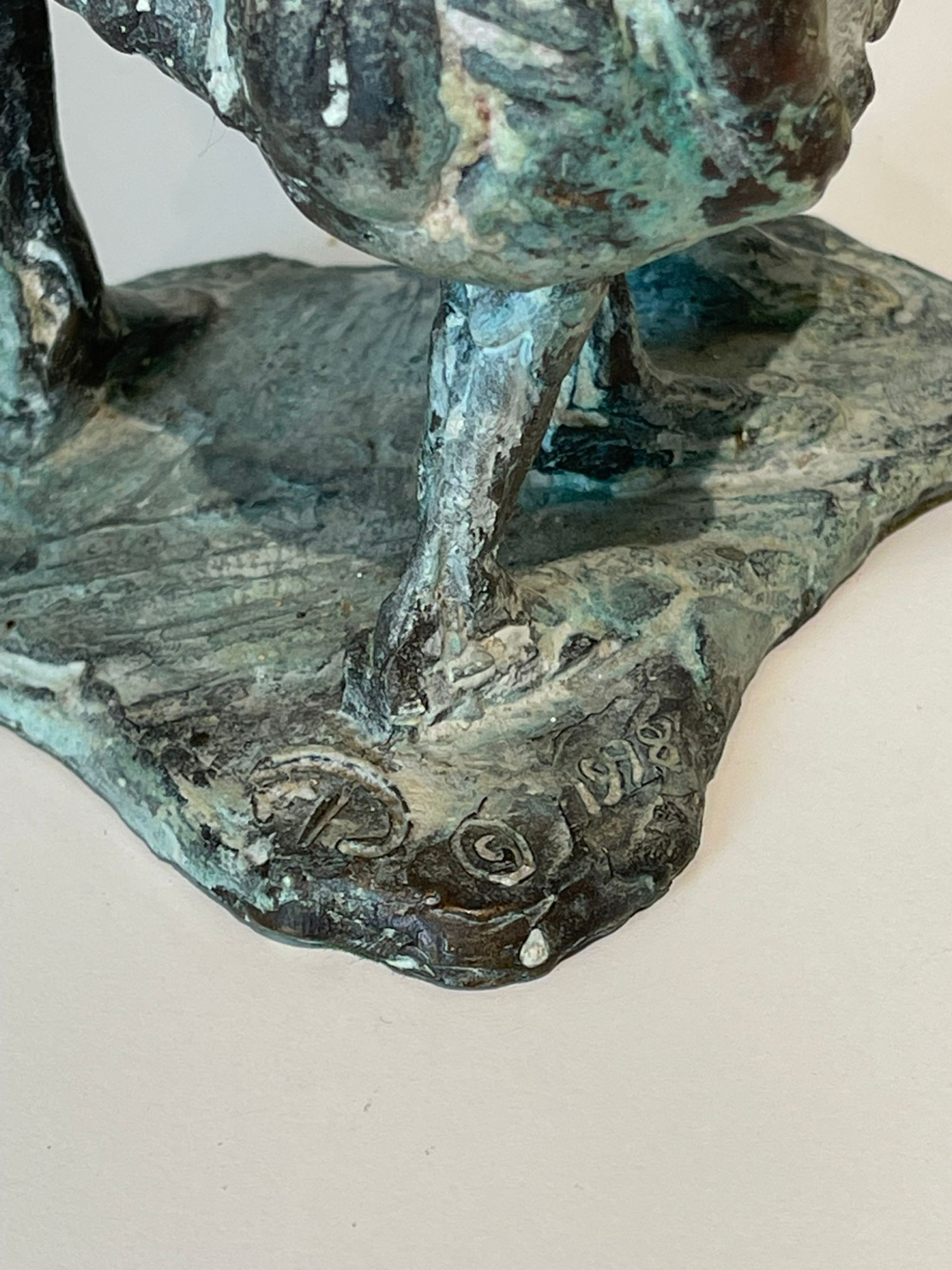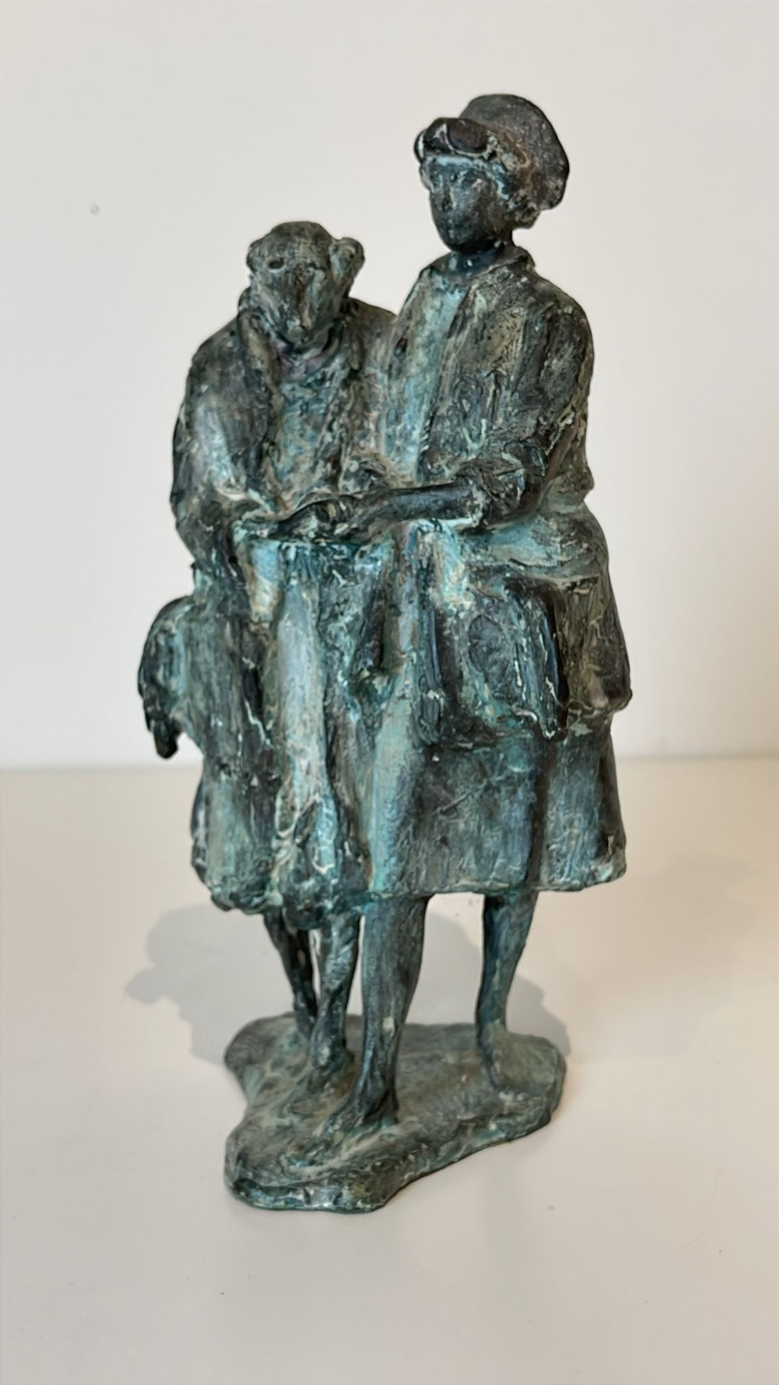 Bronzen sculptuur van twee hand in hand lopende mensen met de titel 'Voortgang van de generaties'. Herdenkingsbeeld voor de moeder van Floyd.